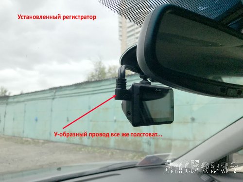 Регистратор я поставил чуть ниже зеркала заднего вида. У-образный провод, который надо подключать непосредственно в видео регистратор достаточно толстый, но под потолочную обшивку спрятался нормально и прижался тоже хорошо.