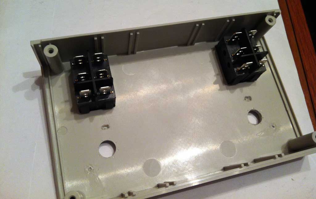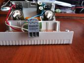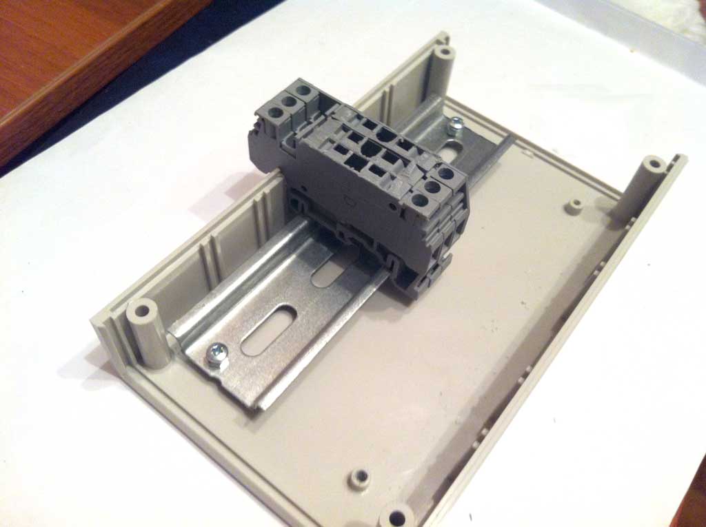 На второй половине крышки коробки установил кусок дин рейки для установки трех клемм. Дин рейка была установлена на имеющиеся в коробке посадочные места и сдвинута к краю коробки так, чтобы часть клемм выступала за стенку коробки.