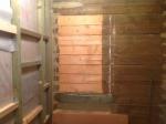 На шип был прикреплен утеплитель и затем вплотную были установлены стойки. Между собой в верхней части оконного проема была установлена поперечная доска 40мм враспор. Между этой доской и верхней частью оконного проема был проложен джутовый утеплитель и сама доска была прикручена несколькими желтыми саморезами.